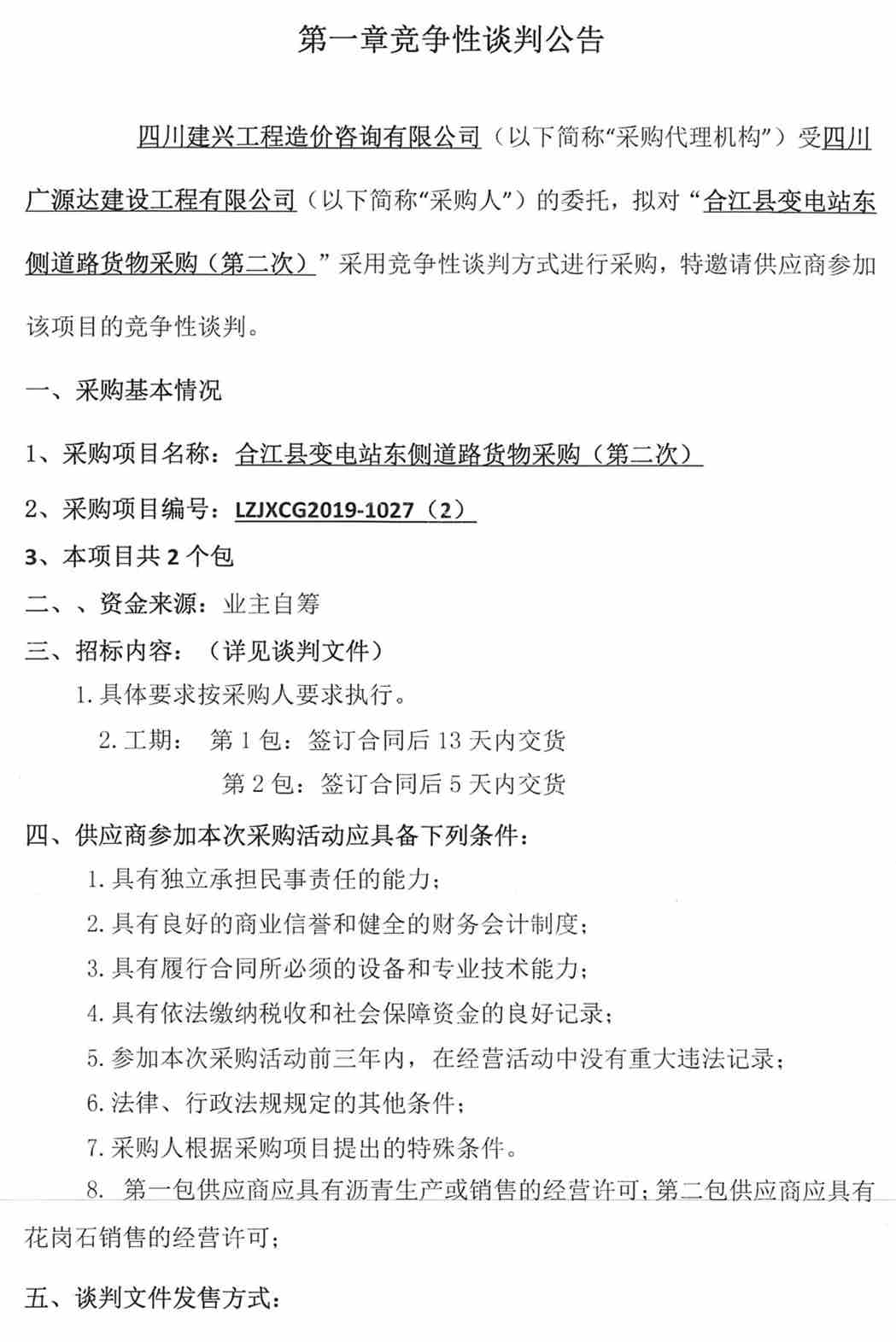 四川廣源達建筑工程有限公司合江縣變電站東側道路貨物采購公告(第二次)