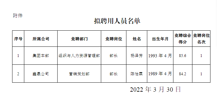根 據(jù) 《 瀘 州 阜 陽(yáng) 投 資 集 團(tuán) 有 限 公 司 關(guān) 于 2022 年 部 分 中 層管理崗位內(nèi)部競(jìng)聘的公告》 的規(guī)定,經(jīng)阜陽(yáng)集團(tuán)黨委研究 決定, 擬聘用楊澤芳、 陳怡霖為瀘州阜陽(yáng)投資集團(tuán)有限公司 中層管理人員。 現(xiàn)面向社會(huì)公示 3 個(gè)工作日, 公示時(shí)間 2022 年 3 月 30 日至 2022 年 4 月 1 日。 公示期間, 如有問(wèn)題, 請(qǐng) 及 時(shí) 向 瀘 州 阜 陽(yáng) 投 資 集 團(tuán) 有 限 公 司 組 織 與 人 力 資 源 管 理 部 反映。 要求舉報(bào)者署實(shí)名, 實(shí)事求是地反映問(wèn)題, 并提供必 要的調(diào)查線索。