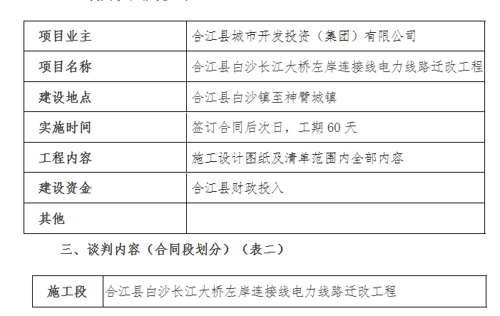 一、 本次談判項(xiàng)目為合江縣白沙長江大橋左岸連接線電力線路遷改工 程, 現(xiàn)通過競爭性談判方式選擇和確定承包人, 誠邀符合資格條件的 潛在申請人參與本項(xiàng)目的競爭性談判。