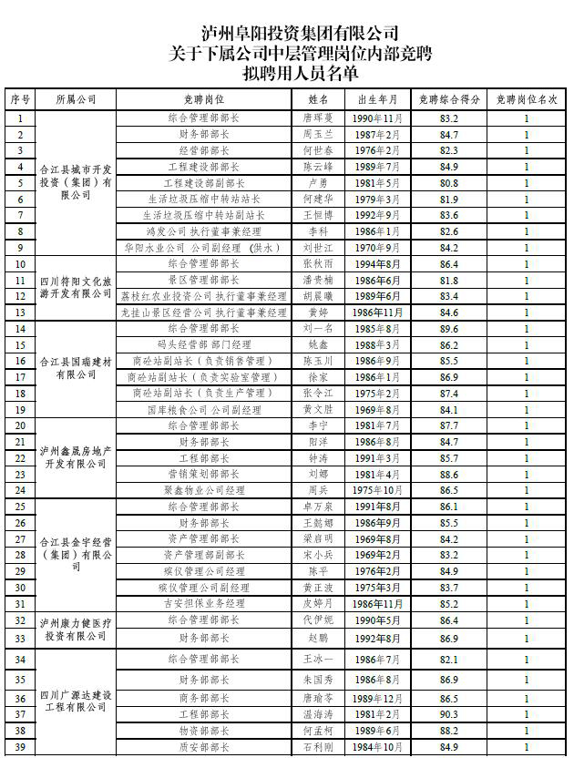 根據(jù)《瀘州阜陽投資集團(tuán)有限公司關(guān)于下屬公司中層管理崗位內(nèi)部競聘工作的公告》(瀘阜投發(fā)〔2020〕21號(hào))的規(guī)定,經(jīng)阜陽集團(tuán)黨委會(huì)研究決定,擬聘用唐琿蔓等39人為瀘州阜陽投資集團(tuán)有限公司下屬公司中層管理人員。現(xiàn)面向社會(huì)公示7日,公示時(shí)間2020年6月19日至2020年6月25日。公示期間,如有問題,請及時(shí)向?yàn)o州阜陽投資集團(tuán)有限公司組織與人力資源管理部反映。要求舉報(bào)者署實(shí)名,實(shí)事求是地反映問題,并提供必要的調(diào)查線索。