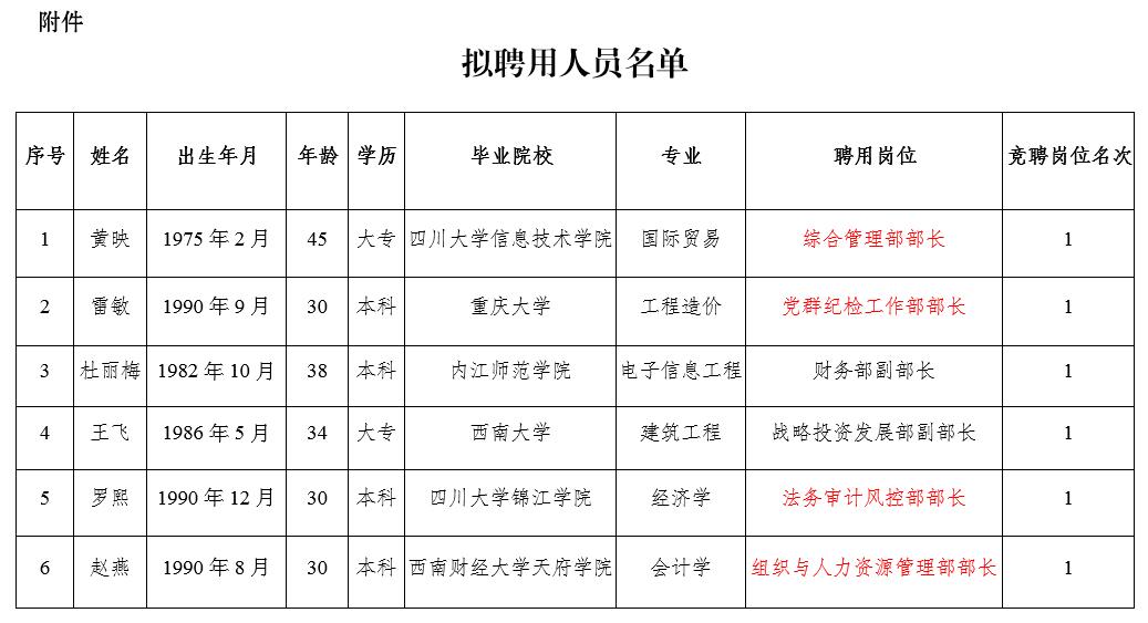 根據(jù)《瀘州阜陽投資集團有限公司關于2020年本部中層管理崗位內部競聘的公告》(瀘阜投〔2020〕20號)規(guī)定,經(jīng)阜陽集團黨委研究決定,擬聘用黃映等6人為瀘州阜陽投資集團有限公司本部中層管理人員?,F(xiàn)面向社會公示7個工作日,公示時間2020年6月2日至2020年6月10日。公示期間,如有問題,請及時向瀘州阜陽投資集團有限公司組織與人力資源管理部反映。要求舉報者署實名,實事求是地反映問題,并提供必要的調查線索。