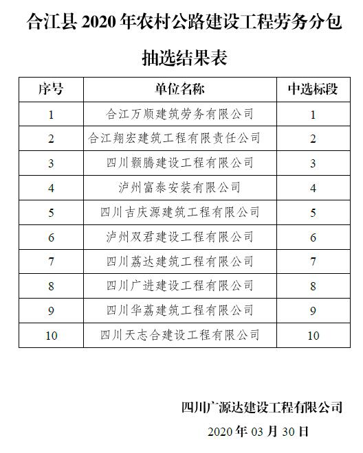 合江縣2020年農村公路建設工程勞務分包抽選結果表