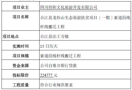 請(qǐng)通過(guò)資格審查的參加競(jìng)爭(zhēng)性談判人員帶好有效身份證、公司介紹信、授權(quán)委托書(shū)、資質(zhì)證明等資料的原件與復(fù)印件(上述復(fù)印件須蓋單位鮮章,原件查驗(yàn)后當(dāng)場(chǎng)退還。于北京時(shí)間2019年9月18日9:00,在四川省瀘州市合江縣荔城大道190號(hào)四川符陽(yáng)文化旅游開(kāi)發(fā)有限公司二樓會(huì)議室公開(kāi)舉行合江縣龍掛山生態(tài)旅游扶貧項(xiàng)目(一期)索道沿線桿線搬遷工程競(jìng)爭(zhēng)性談判活動(dòng),四川符陽(yáng)文化旅游開(kāi)發(fā)有限公司根據(jù)承諾報(bào)價(jià)最低價(jià)原則確定中選人。